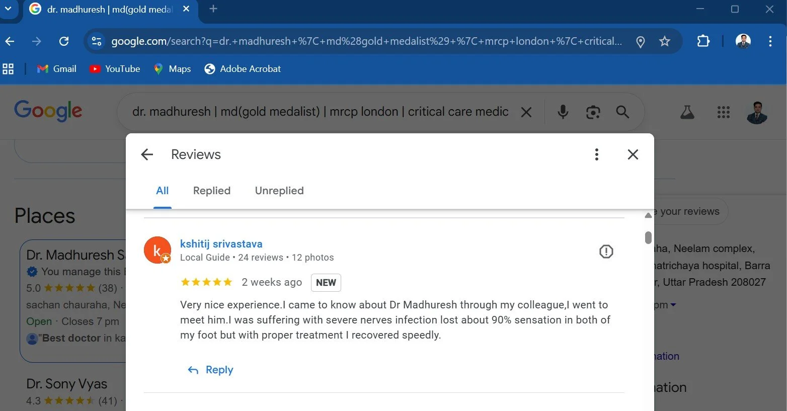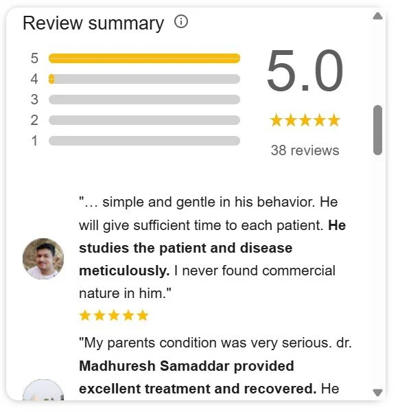 “Very nice experience.I came to know about Dr Madhuresh through my colleague,I went to meet him.I was suffering with severe nerves infection lost about 90% sensation in both of my foot but with proper treatment I recovered speedly..” - kshitij srivastava