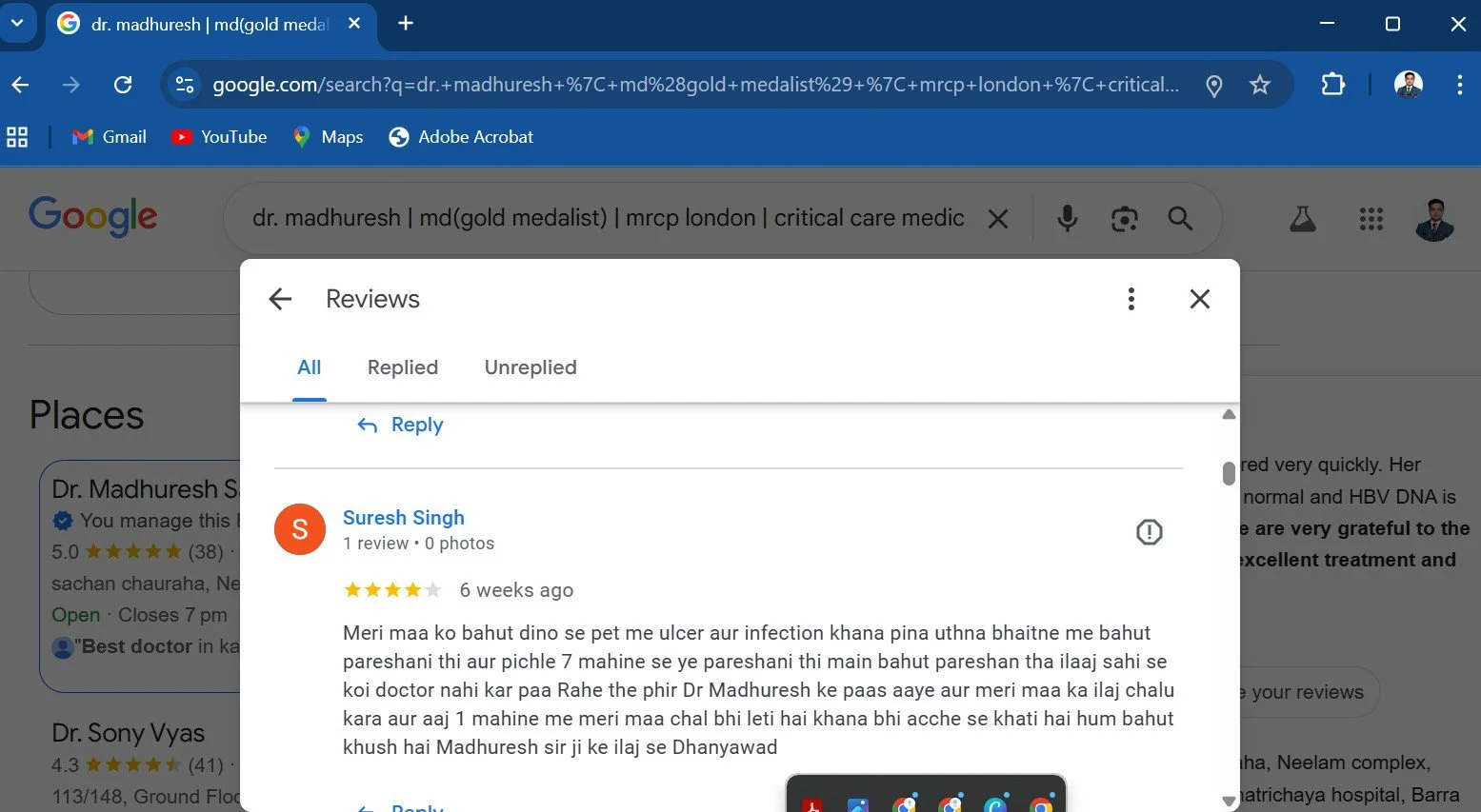 “मेरी माँ को बहुत दिनों से पेट में अल्सर और इन्फेक्शन खाना पीना चाहिए, मुझे बहुत परेशानी थी और पिछले 7 महीने से ये परेशानी थी मैं बहुत परेशान था इलाज सही से कोई डॉक्टर नहीं कर पा रहे थे फिर डॉक्टर मधुरेश के पास आये और मेरी माँ का इलाज चालू करा और आज 1 महीने में मेरी मां चल भी लेती है खाना भी अच्छे से खाती है हम बहुत खुश हैं मधुरेश सर जी के इलाज से धन्यवाद.” - Suresh Singh