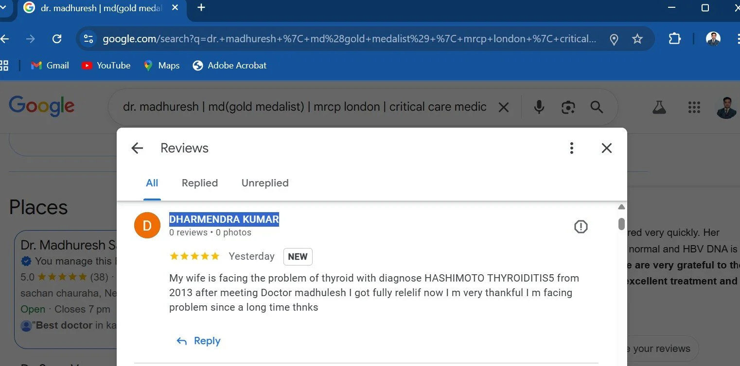 "My wife is facing the problem of thyroid with diagnose HASHIMOTO THYROIDITIS5 from 2013 after meeting Doctor madhulesh I got fully relelif now I m very thankful I m facing problem since a long time thnks." - DHARMENDRA KUMAR
